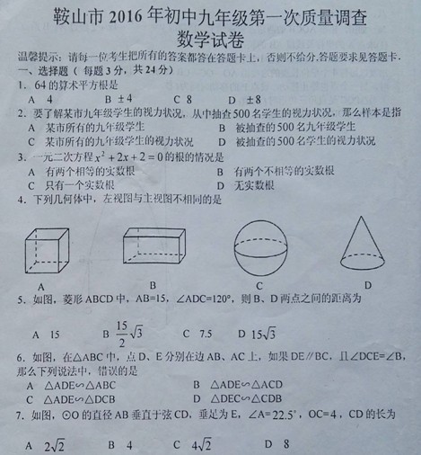 鞍山市2016届中考第二次质量调查(二模)数学试题含答案
