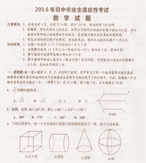 2016年十堰市初中毕业生学业水平考试数学试卷及答案(扫描版)