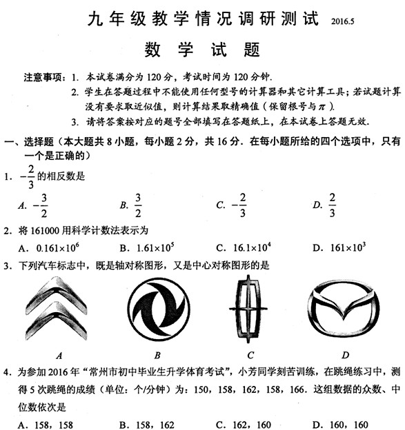常州市2016届九年级5月教学情况调研数学试题含答案(扫描版)