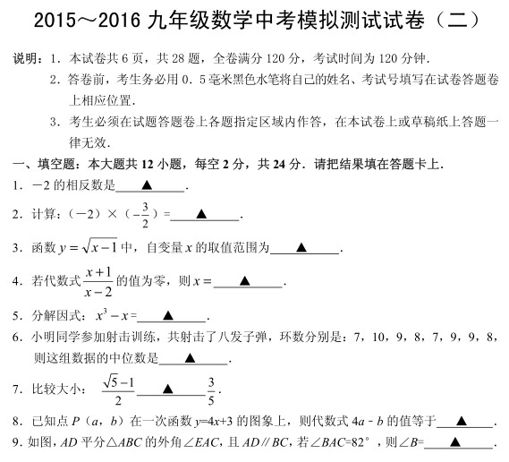 2016年镇江市中考数学网上阅卷模拟训练及答案