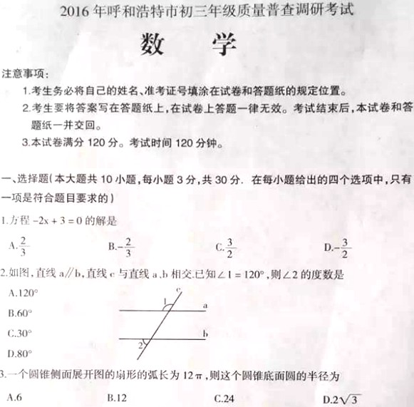 呼和浩特市2016年中考数学试题含答案(扫描版)