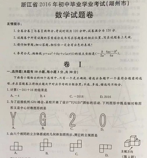浙江省湖州市2016年中考数学试题及答案解析(word版)