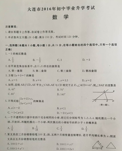 辽宁省大连市2016年中考数学试卷及答案解析(word版)