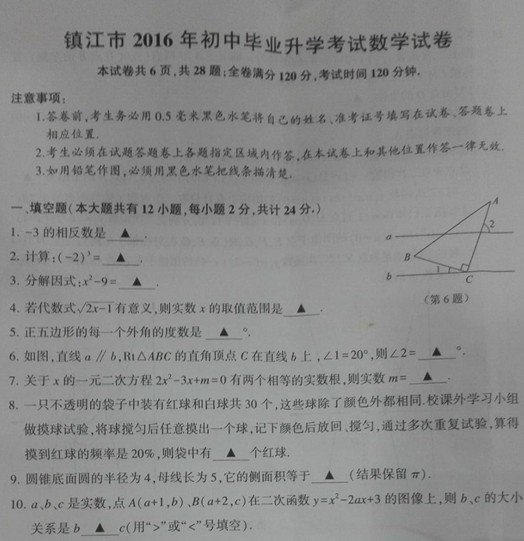 2016年镇江市中考数学网上阅卷模拟训练及答案