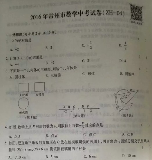 江苏省常州市2016届中考二模数学试题含答案(扫描版 )