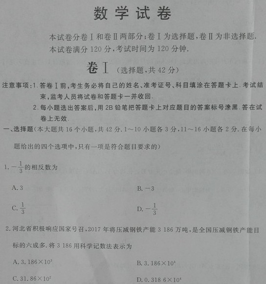 河北省邢台市2015届中考数学一模试题及答案(扫描版)