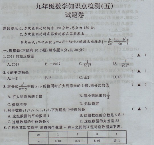 【真题】2017年湖州市中考数学试题及答案解析(word版)