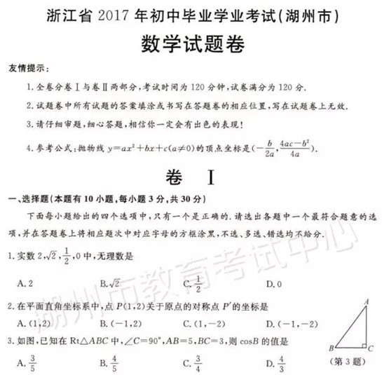【真题】2017年湖州市中考数学试卷及答案(word版)