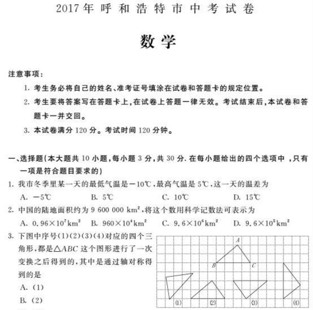 【真题】2017年呼和浩特市中考数学试卷含答案(Word版)
