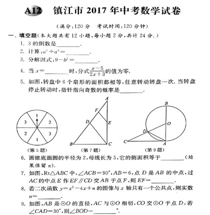 【真题】2017年江苏省镇江市中考数学试题含答案(Word版)