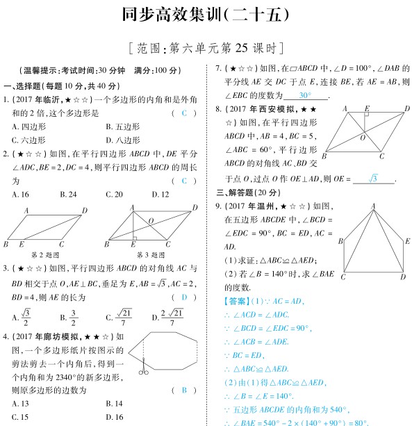 2018年安徽中考数学复习教材整理:第25课时多边形与平行四边形