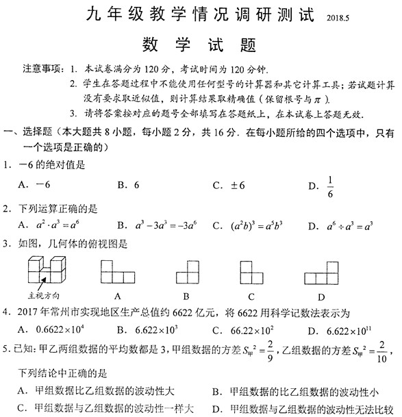 常州市2016届九年级5月教学情况调研数学试题含答案(扫描版)